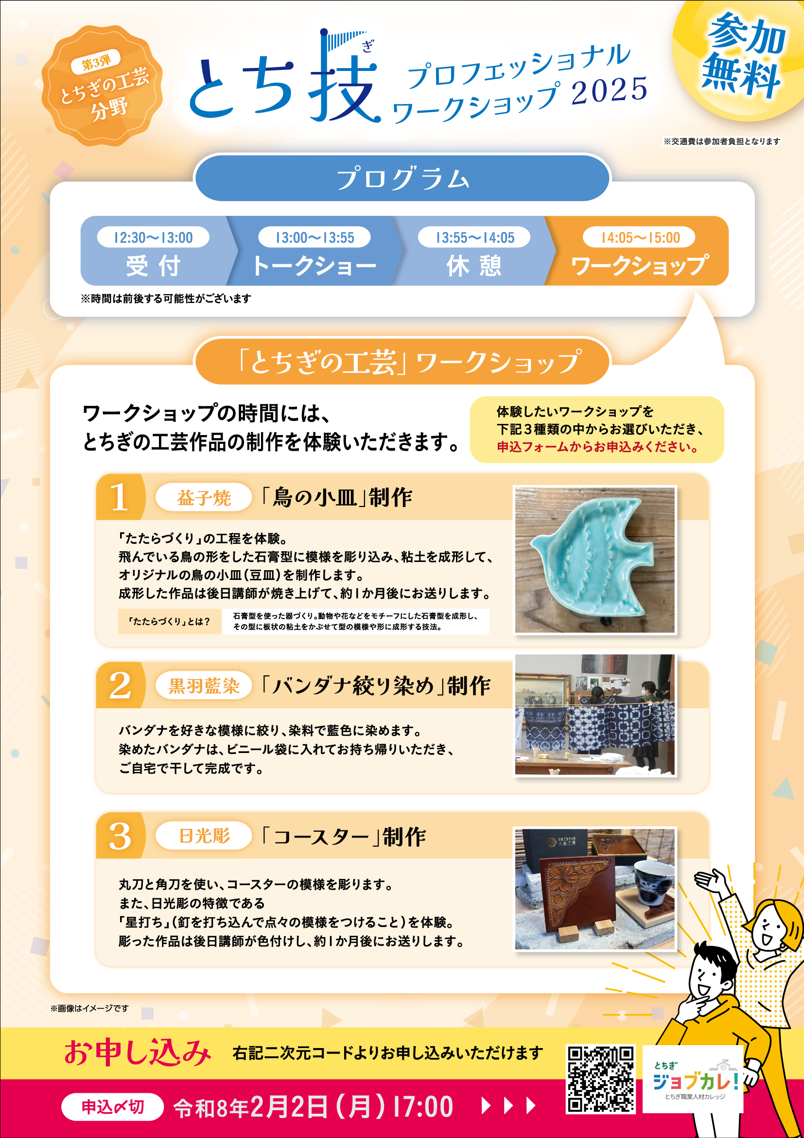 「調理・製菓」「ものづくり」「とちぎの工芸」をテーマに、それぞれのスペシャリストを招いて「栃木の技」を体感できる ワークショップを開催します!