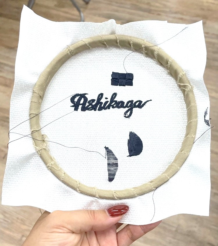 針が左右に動く“横ぶりミシン”を使って、職人さんが手で布を操りながら、絵を描くように刺繍していく、日本ならではの伝統技術なんです。まるでアート作品みたいな立体感が出せるのが魅力!